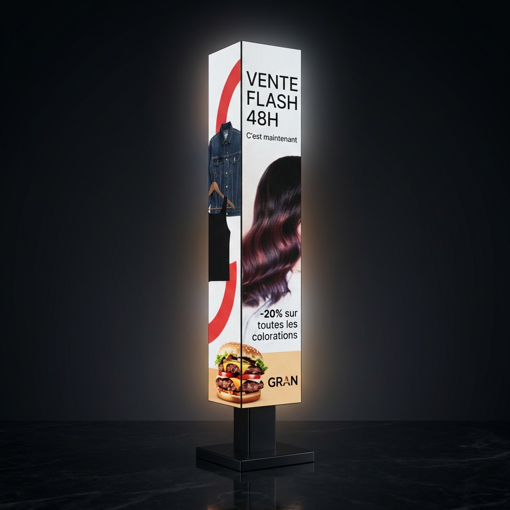 Quatre faces LED haute densité, contenu synchronisé en temps réel, gestion à distance. Bien plus qu'un simple écran, c'est un outil de vente surpuissant, conçu pour le quotidien des commerçants exigeants.